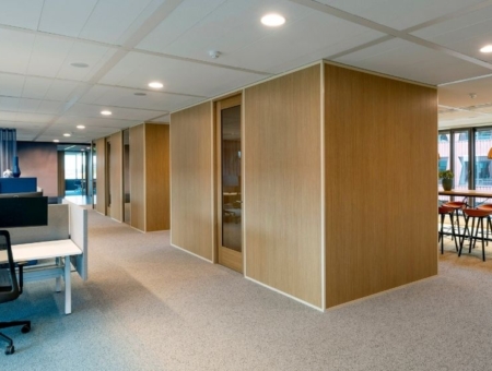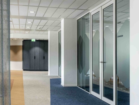 Deze glazen deur voorzien van een aluminium kader. Indien gewenst kan de deur worden voorzien van akoestisch glas en een valdorpel voor extra geluidsisolatie.